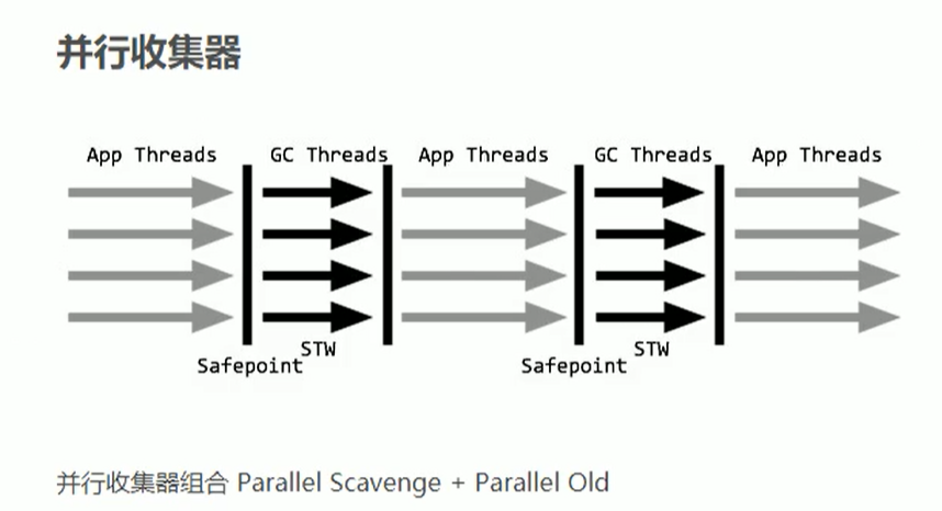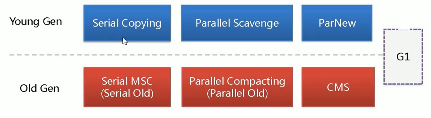 | -XX:+UseParallelGC | Parallel [Scavenge] | 复制 | Parallel Old | 标记整理 |