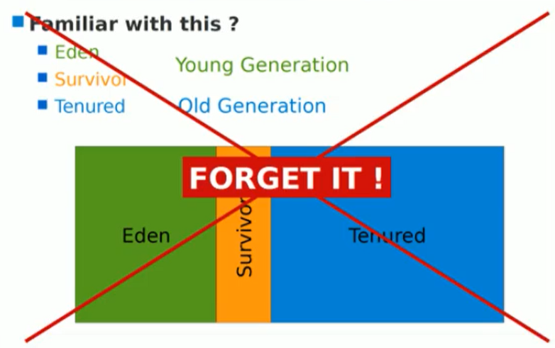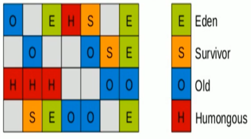 主要改变时:Eden,Survivor和Tenured等内存区域不再是连续了,而是变成一个个大小一样的region,每个region从1M到32M不等。一个region有可能属于Eden,Survivor或者Tenured内存区域。