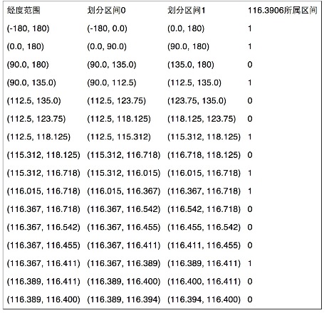 同理,地球经度区间是[-180,180],对经度116.3906进行编码的过程也类似: