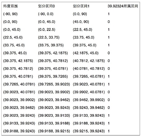 - 区间[-90,90]进行二分为[-90,0),[0,90],称为左右区间,可以确定39.92324属于右区间[0,90],给标记为1;
