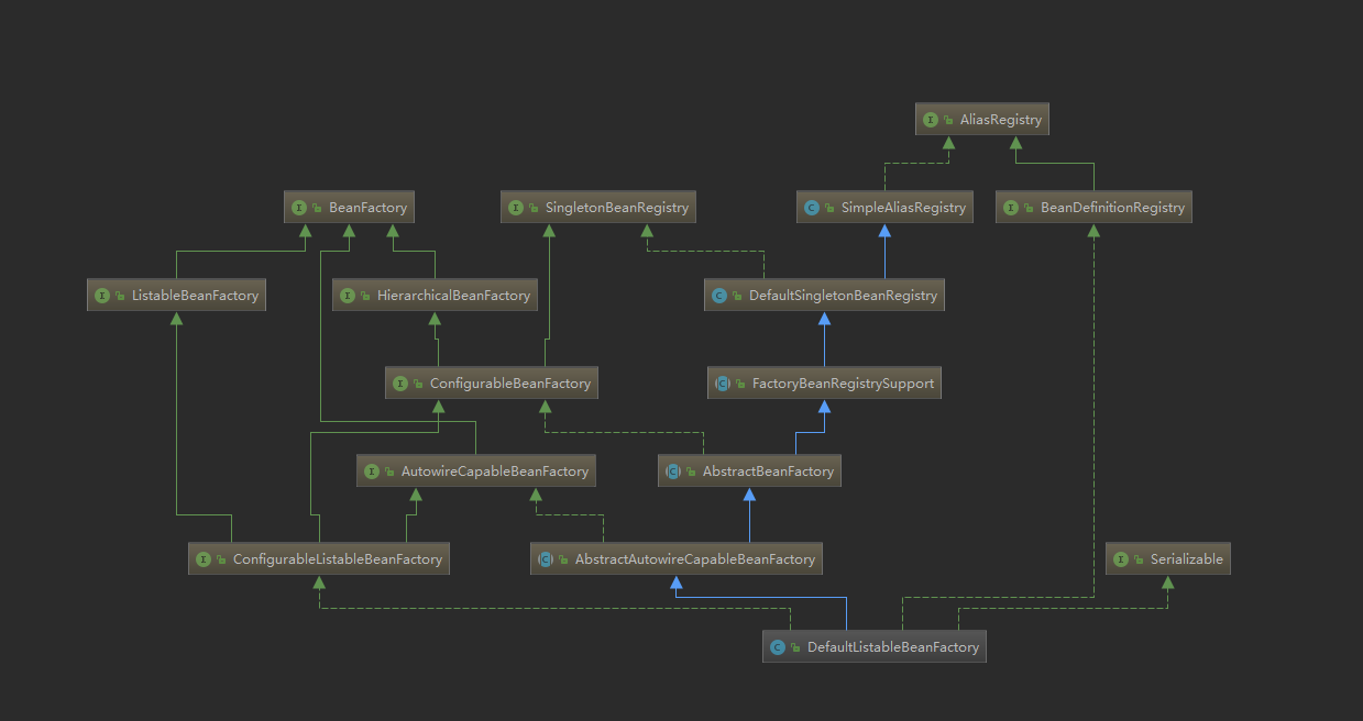 BeanFactory 简单粗暴,可以理解为就是个 HashMap,Key 是 BeanName,Value 是 Bean 实例。通常只提供注册(put),获取(get)这两个功能。我们可以称之为 “低级容器”。