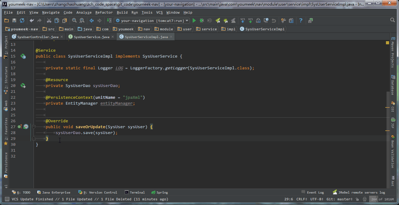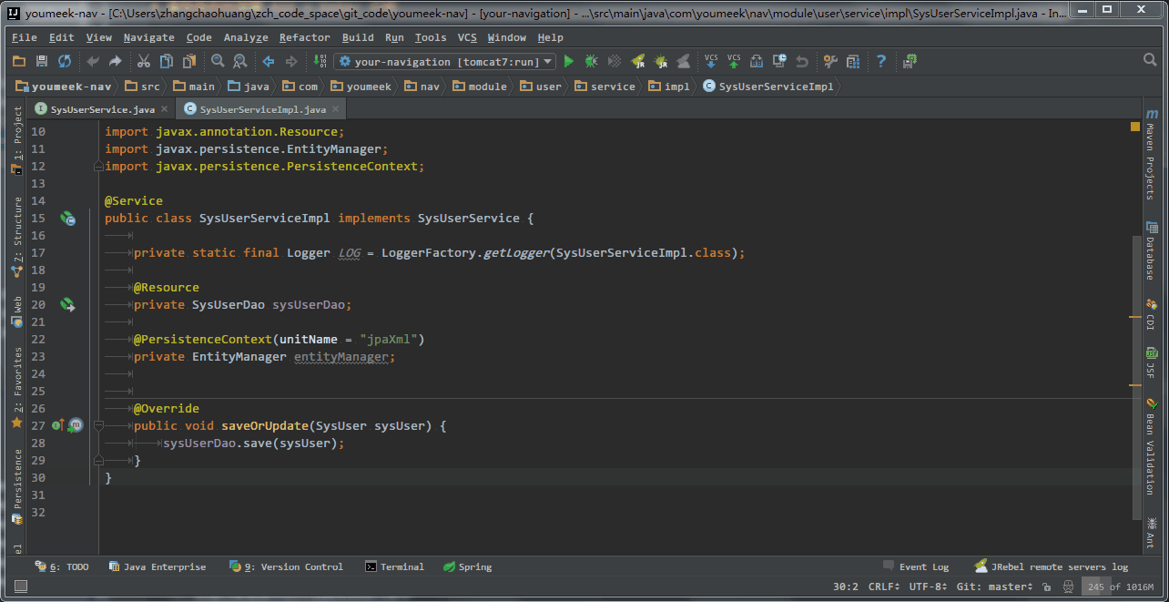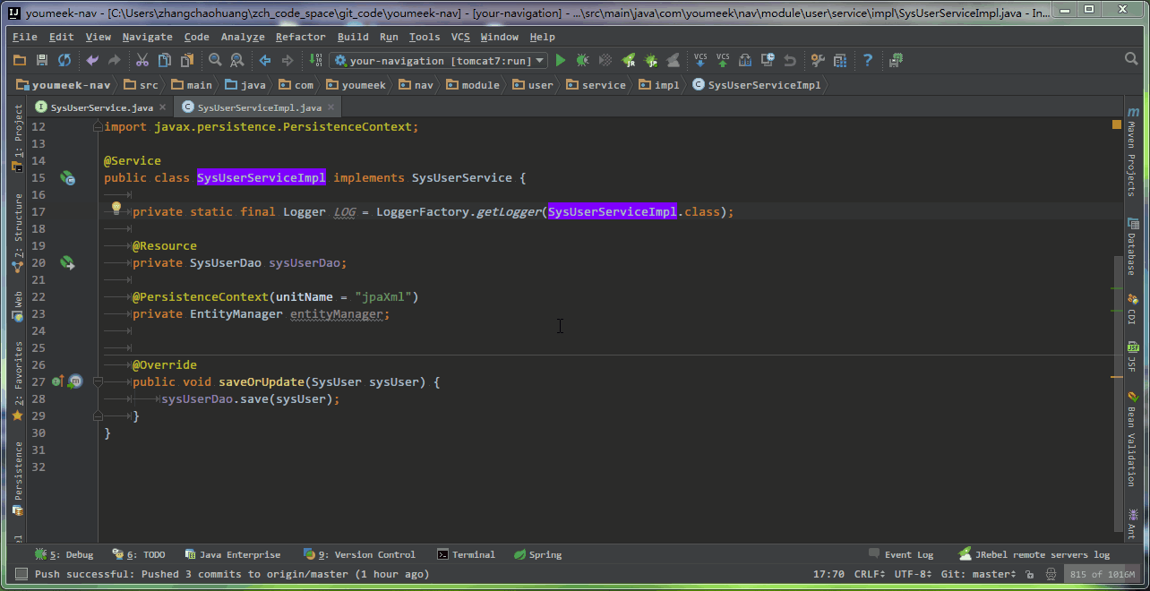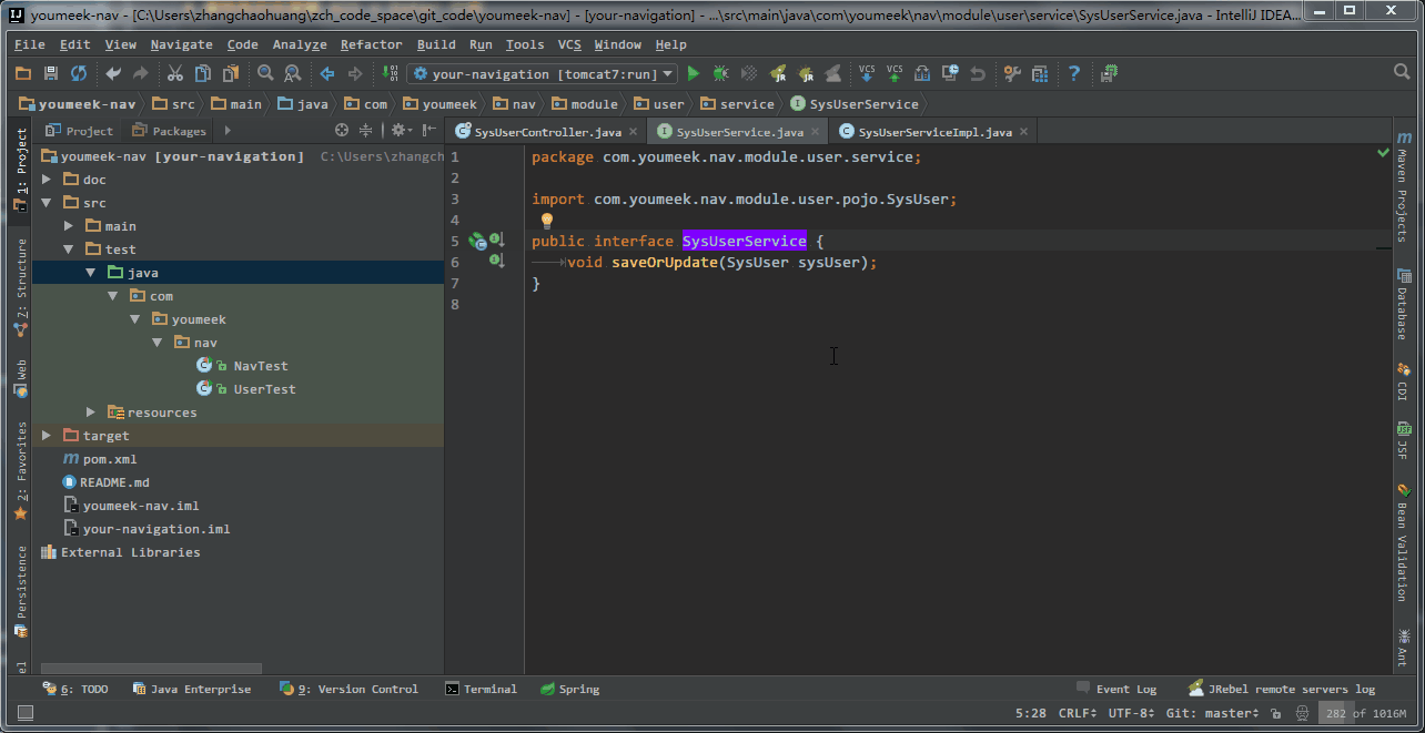 - 在 接口类 中,如果光标当前所在的方法,已经在 接口实现类 中生成了,则此快捷键的效果是跳转。