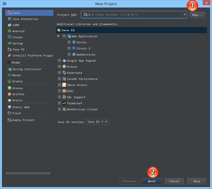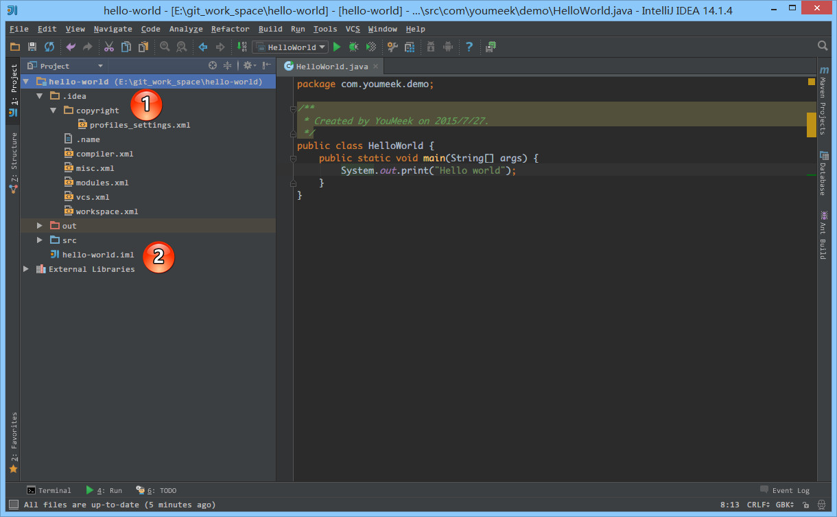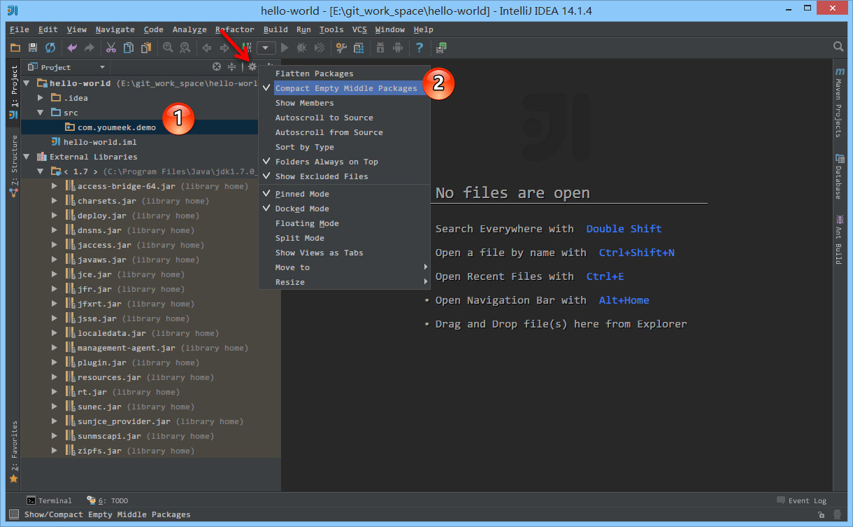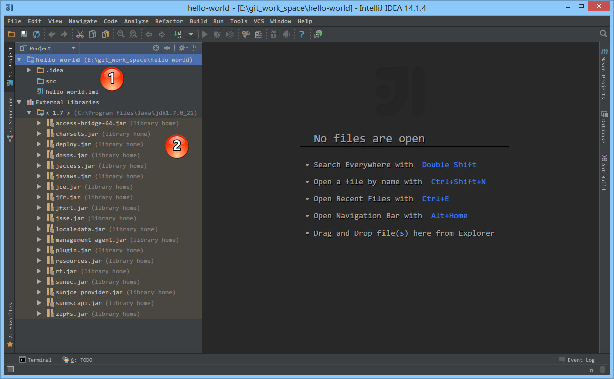 src目录为蓝色表示Source root,我们可以再此目录下创建包和类。- 如上图标注 2 所示,由于该项目使用的是 JDK 7,所以项目是基于 JDK 7,我们可以调用 JDK 7 中的类。