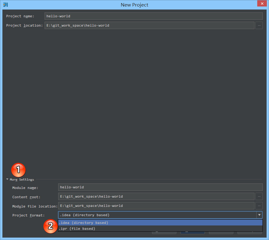 More Settings是没有展开的,点击此处可以展开更多细节的信息。- 如上图标注 2 所示,IntelliJ IDEA 的项目格式文件主要提供两种方式