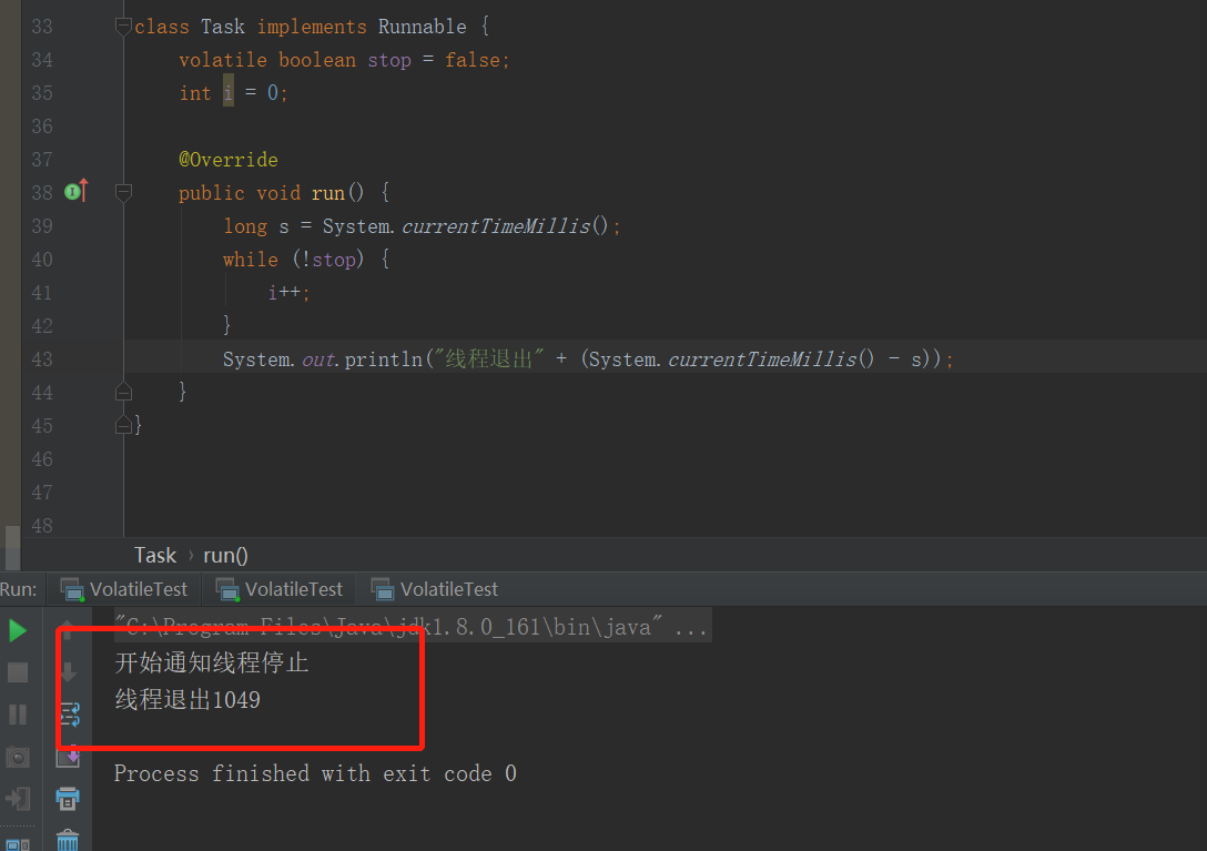 可以发现线程t2,虽然把stop设置为true了,但是线程t1对t2的stop变量视而不可见,因此,它一直在死循环running中。如果给变量stop加上volatile修饰,线程t1是可以停下来的,运行结果如下: