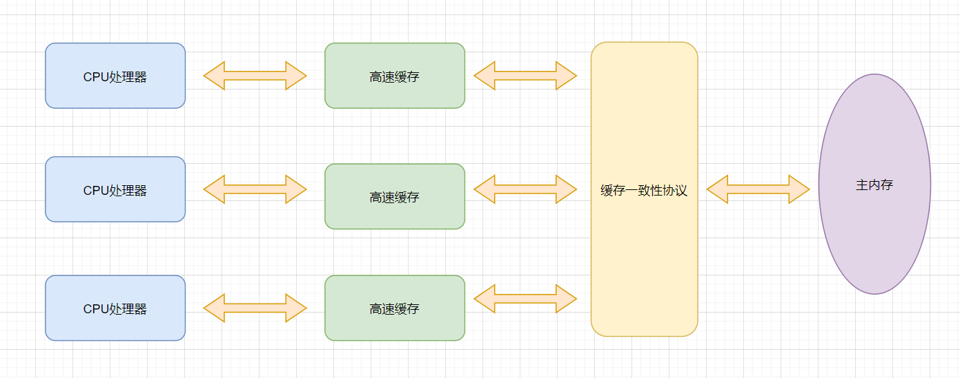 在多路处理器系统中,每个处理器都有自己的高速缓存,而它们共享同一主内存。计算机抽象内存模型如下: