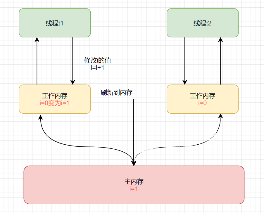 首先,执行线程t1从主内存中读取到i=0,到工作内存。然后在工作内存中,赋值i+1,工作内存就得到i=1,最后把结果写回主内存。因此,如果是单线程的话,该语句执行是没问题的。但是呢,线程t2的本地工作内存还没过期,那么它读到的数据就是脏数据了。如图: