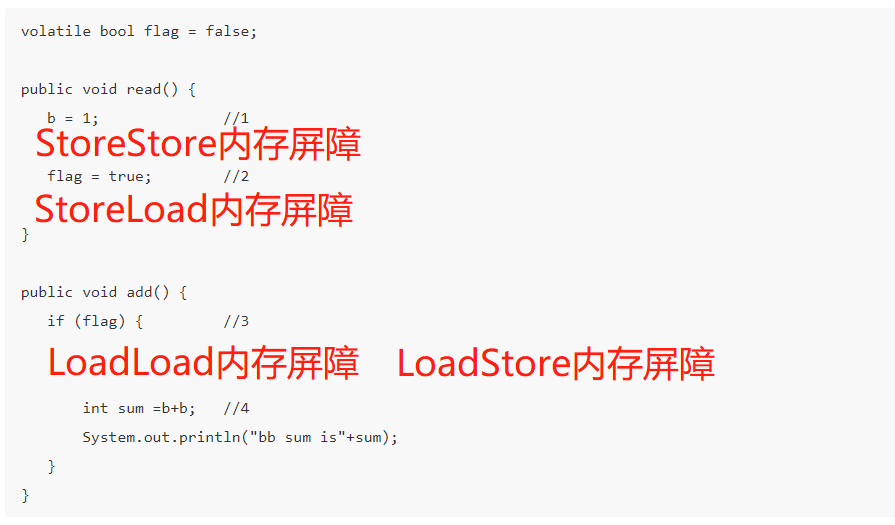有些小伙伴,可能对这个还是有点疑惑,内存屏障这玩意太抽象了。我们照着代码看下吧(LoadLoad内存屏障也是在flag后面哈,图片有误):