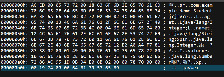 看看序列化的可爱模样吧,test.out文件内容如下(使用UltraEdit打开):
