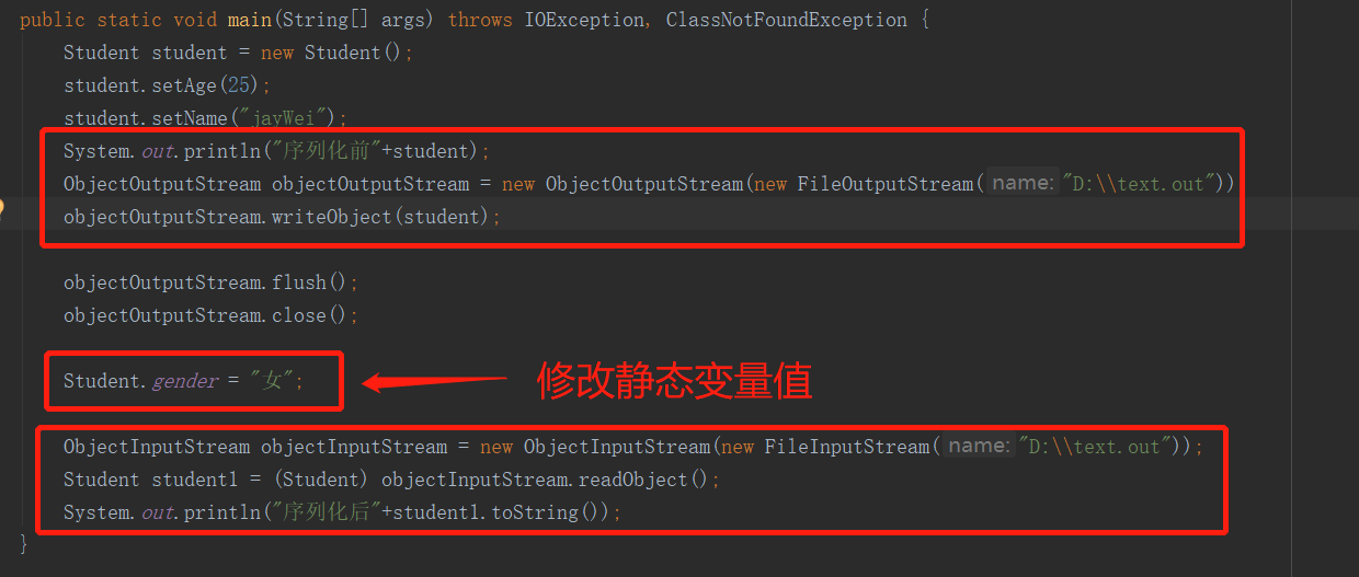 static静态变量和transient 修饰的字段是不会被序列化的,我们来看例子分析一波~ Student类加了一个类变量gender和一个transient修饰的字段specialty