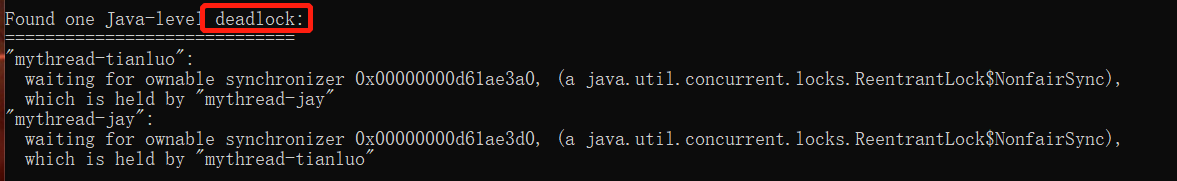 - mythread-jay线程等待这个锁“0x00000000d61ae3d0”,这个锁是由mythread-tianluo 线程持有。