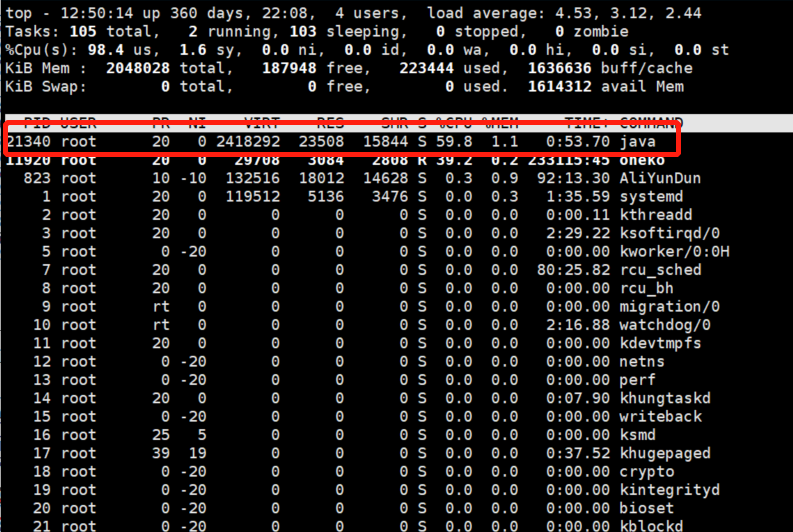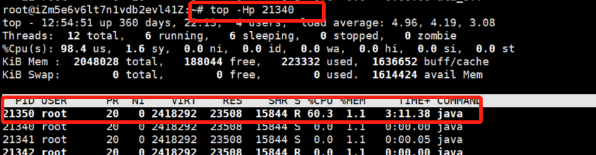 由上图中,我们可以找出pid为21340的java进程,它占用了最高的cpu资源,凶手就是它,哈哈!