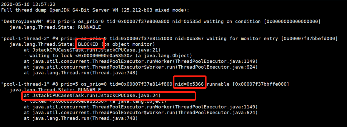 在thread dump中,每个线程都有一个nid,我们找到对应的nid(5366),发现一直在跑(24行)