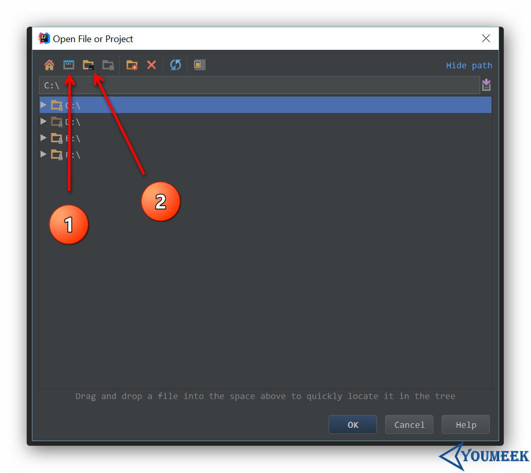 - 如上图所示,不管是用 IntelliJ IDEA 打开新文件,或是在安装本地插件,在弹出的窗口中,图 1 按钮支持快速定位到系统桌面目录,图 2 按钮支持快速定位到当前项目目录。