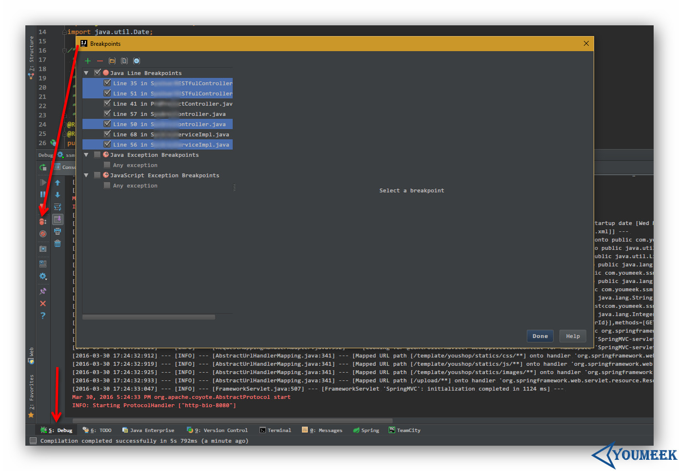 - 如上图箭头所示,在 Debug 状态下,如果我们要批量删除断点,可以点击图上箭头所示的按钮,然后选中要删除的断点按断点上面的减号进行删除。