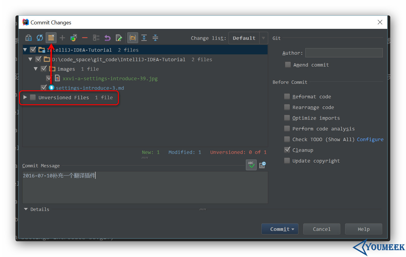 - 2016.2 版本新增箭头指向的按钮,在提交列表里可以显示项目中未加入到版本控制的文件,方便我们在提交的时候做好代码检查,以防漏掉某些文件未提交。