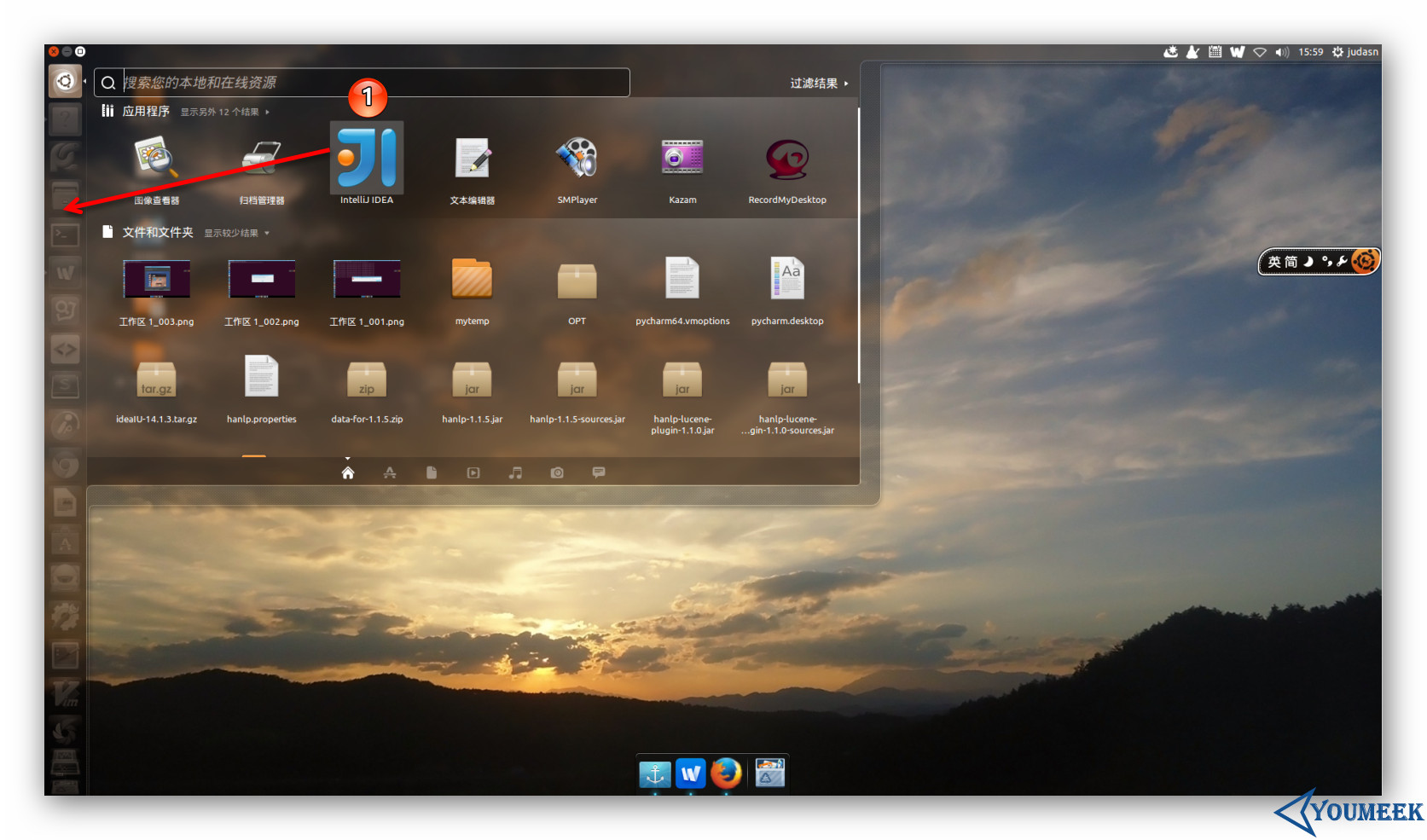 - 创建完启动图标之后,我们可以在如上图标注 1 所示的 Dash 这个地方找到 IntelliJ IDEA 图标。但是图标我们一般是放在启动栏上的,所以这里你可以按着箭头的方向拖动 IntelliJ IDEA 图标到启动栏上即可。