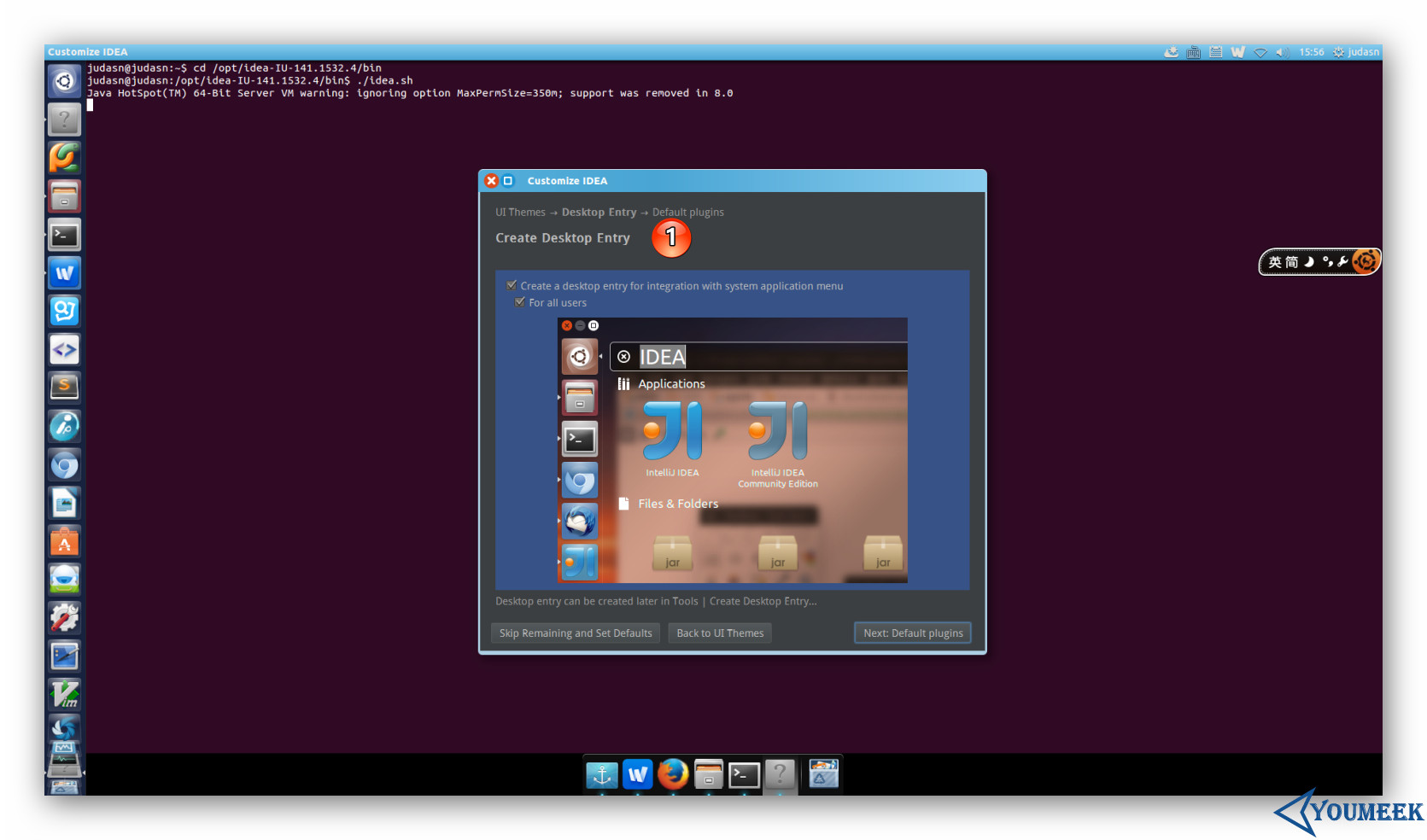- 其中,在整个首次启动的配置过程中,唯一跟 Windows 不太一样的就是上图标注 1 这个地方。原因是 Linux 下创建启动图标是非常非常非常的麻烦,所以 IntelliJ IDEA 帮我们考虑到了,所以只要勾选下即可解决这种麻烦事。