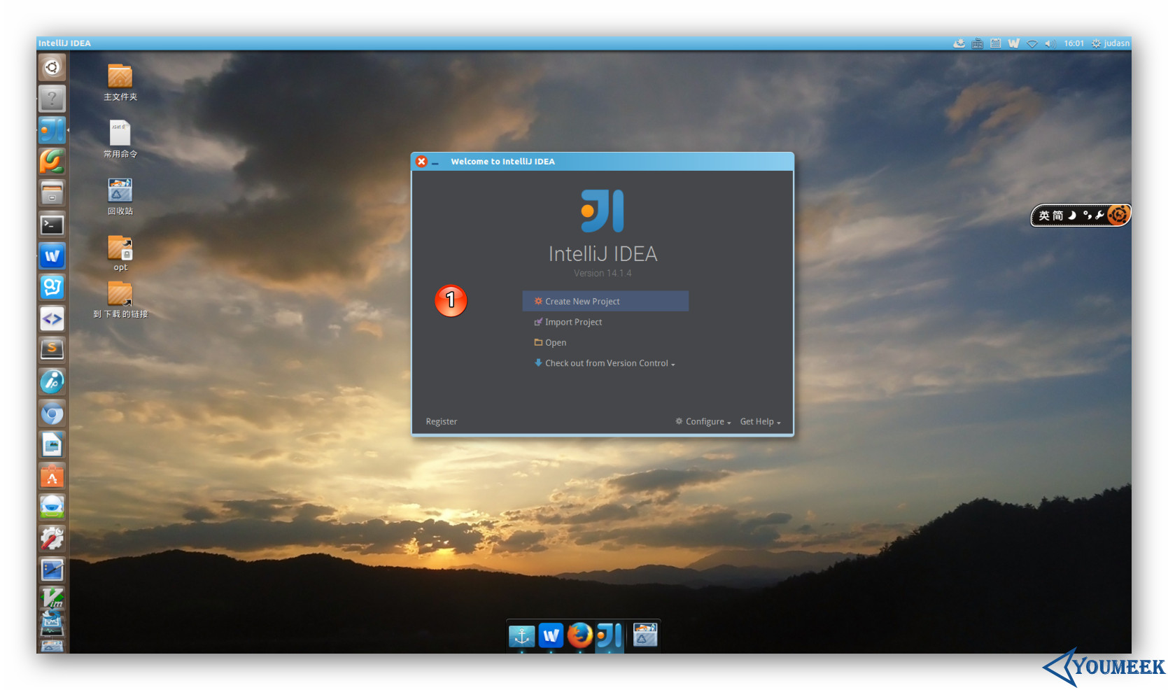 bin 子目录下,然后在终端下运行启动命令:./idea.sh,运行的效果如上图箭头所示。剩下的配置步骤就跟 Windows 基本一样了,如标注 1 所示,所以这里不多讲。