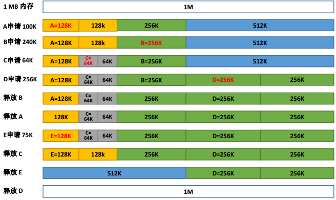 2的整数次幂进行划分,组成若干空闲块表;查找该链表找到能满足进程需求的最佳匹配块。 - 算法