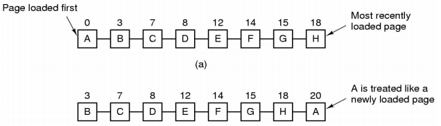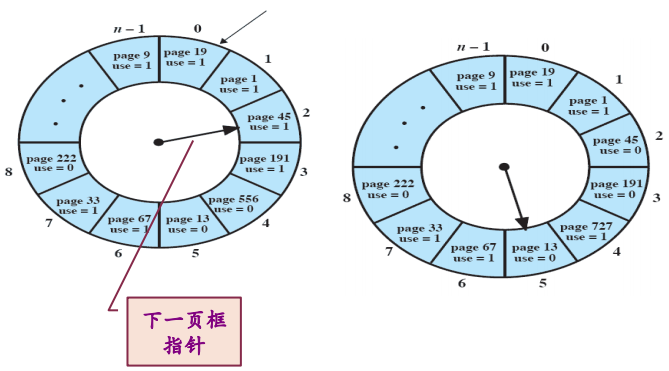 r=0;m=1)的页框(本次扫描工程中,对每个跳过的页框,将其使用位置为零)3、如果第二部失败,指针将回到它的最初位置,并且集合中的所有页框的使用位均为零。重复第一步,并且,如果有必要,重复第二步,这样将可以找到置换的页框。