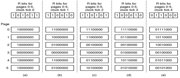 这样如果R值为零,则计数器没有影响,如果值为1,则会变得很大,于是如果一个页面长久不被访问,则计数器值就会越来越小。最后选择值最小的置换出去。