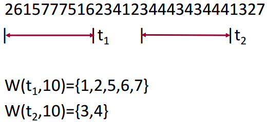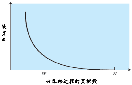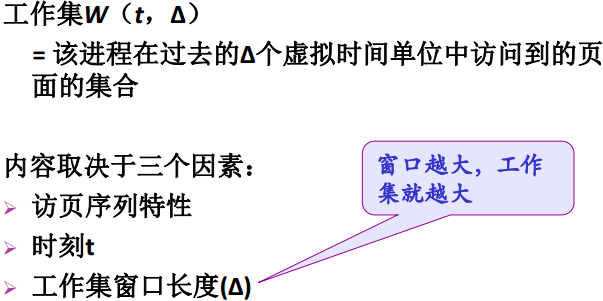 **说明:**可以看到页框数越多那么缺页率越低,但是我们不可能给出所有的页框,于是需要找到一个平衡点W,超过这个点之后页框数的增加对缺页率的降低有限,这也是工作集算法的出发点。