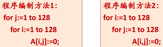 可以看到左边是按列赋值,右边是按行赋值。按列编制就是首先读入第一页(一行,因为矩阵是按行存放的),然后给第0个位置赋值,每次读入一行,直到将第0列赋值完,读完之后再给第1列赋值,这样会产生128*128次缺页异常;而按行赋值,第一次读入一页,给第0行的所有元素赋值,这样会产生128次缺页异常。于是可以看到程序的编制方法对缺页次数是有很大影响的。