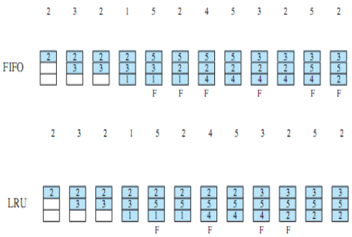 可以看到FIFO发生六次缺页异常,而LRU发生四次缺页异常。
