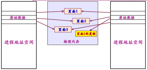 **说明:**如图,两个进程共享同一块物理内存,每个页面都被标志成了写时复制。注意:共享的物理内存中每个页面都是只读的。如果每个进程想改变某个页面时,就会与只读标记冲突,而系统在检测出页面是写时复制的,则会在内存中复制一个页面,然后进行写操作。新复制的页面对执行写操作的进程是私有的,对其他共享写时复制页面的进程是不可见的。