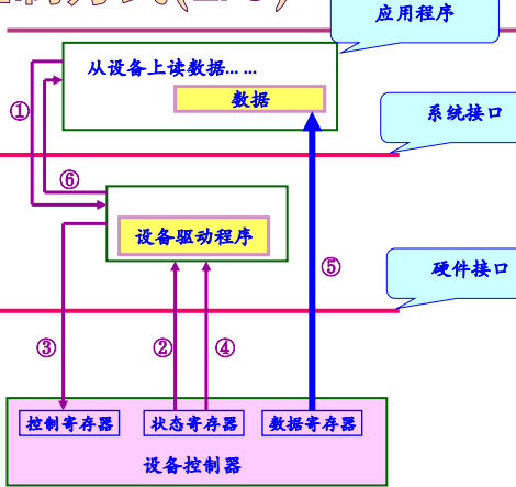 - 操作系统将命令写入控制器的接口寄存器(或接口缓冲区)中,以实现输入/输出,并从接口寄存器读取状态信息或结果信息