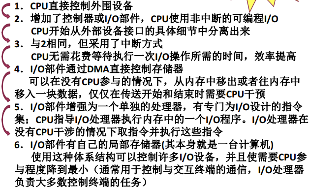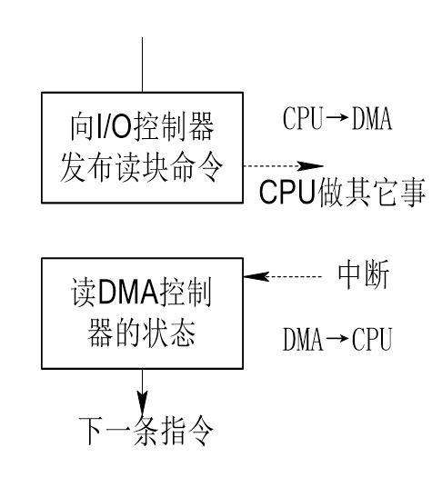 为了减少设备驱动程序不断地询问控制器状态寄存器的开销。I/O操作结束后,由设备控制器主动通知设备驱动程序 DMA(直接存储器访问)