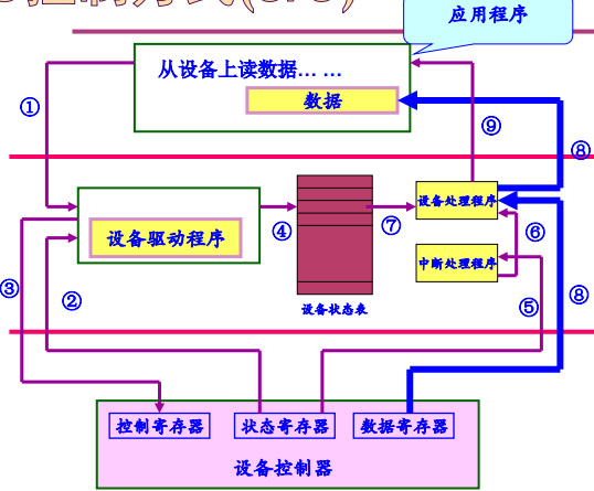 CPU完成指定操作,CPU可以另外执行其他计算;命令完成时,控制器产生一个中断,CPU响应中断,控制器转给操作系统;通过读控制器寄存器中的信息,获得操作结果和设备状态 - 控制器与设备之间的接口常常是一个低级接口