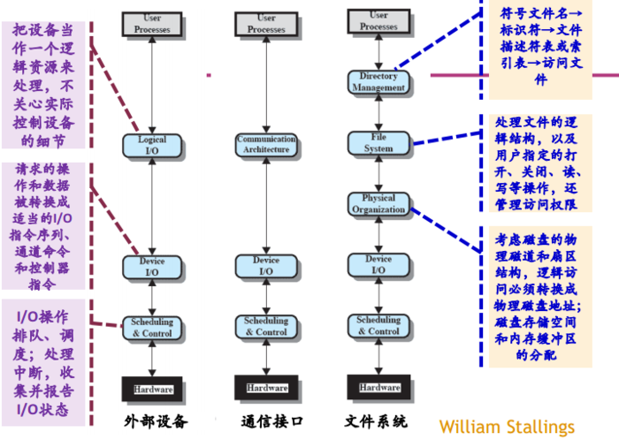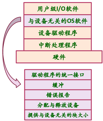 为实现设备无关性,设备作为特殊文件传处理。用户的IO请求、对命令的合法性检查以及参数处理在文件系统中完成。在需要各种设备执行具体操作时,通过相应的数据结构转入不同的设备驱动程序 - 与系统引导的接口(初始化,包括分配数据结构建立设备的请求队列)