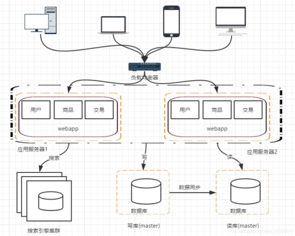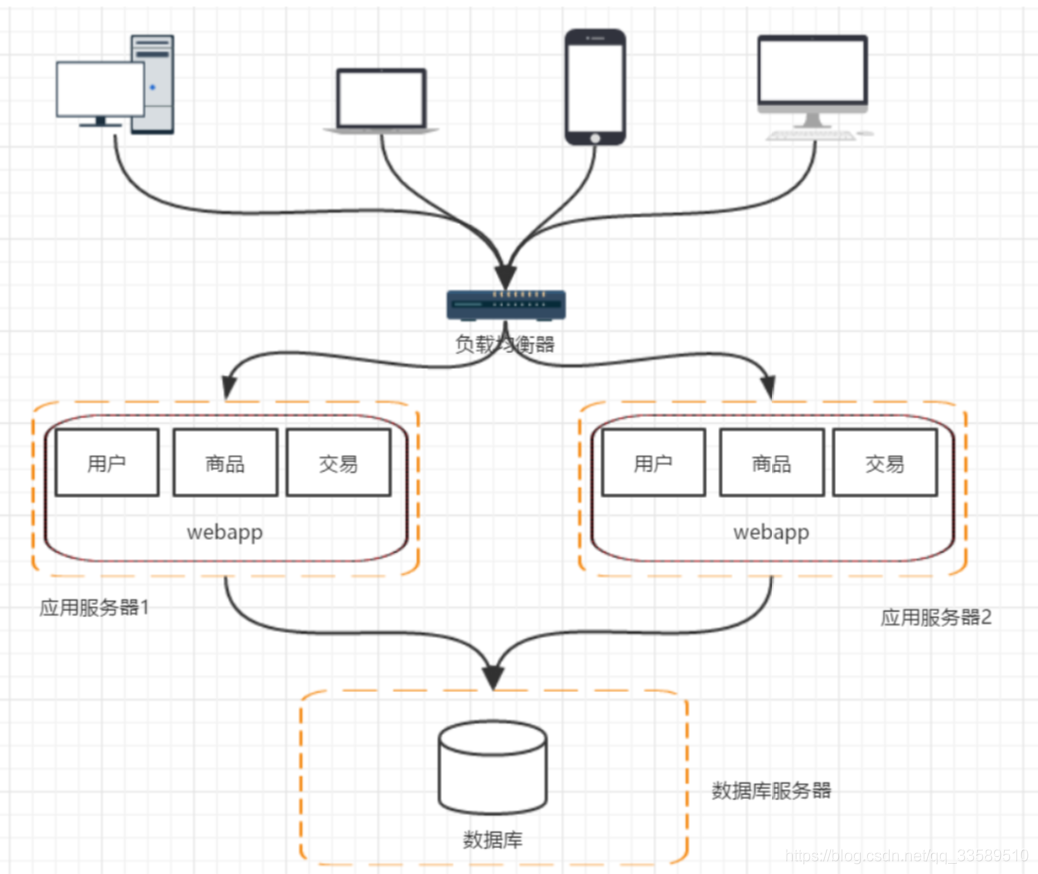 随着访问量的继续增加,单台应用服务器已经无法满足需求。 在假设数据库服务器还没有遇到性能问题的时候,我们可以增 加应用服务器,通过应用服务器集群将用户请求分流到各个服务器中,从而继续提升负载能力。此时多台应用服务器之间没 有直接的交互,他们都是依赖数据库各自对外提供服务架构发展到这个阶段,各种问题也会慢慢呈现