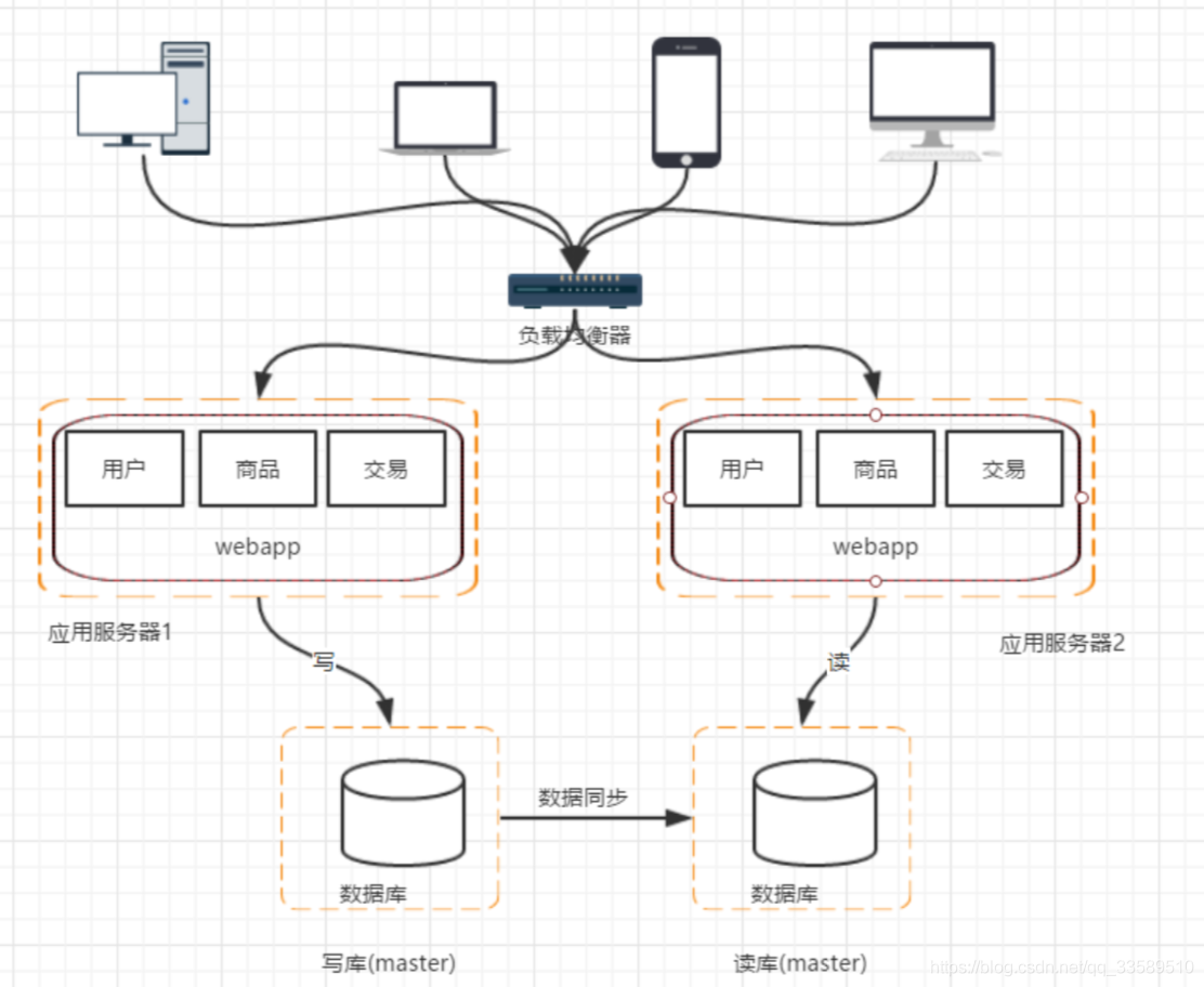 有了前面的思路以后,自然会想到增加服务器。但是假如我们单纯的把数据库一分为二,然后对于后续数据库的请求,分别负 载到两台数据库服务器上,那么一定会造成数据库不统一的问题。 所以我们一般先考虑读写分离的方式