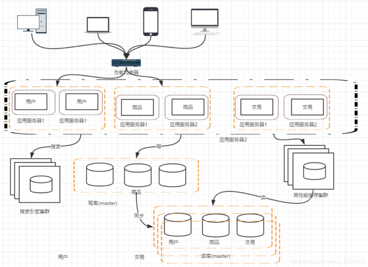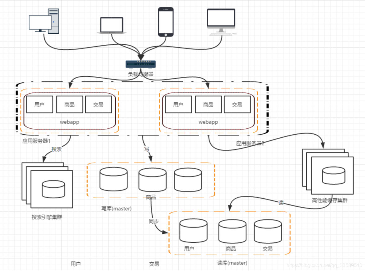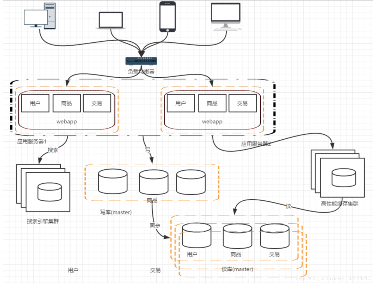 我们的网站演进的变化过程,交易、商品、用户的数据都还在同一 个数据库中,尽管采取了增加缓存,读写分离的方式,但是随着数 据库的压力持续增加,数据库的瓶颈仍然是个最大的问题。因此我 们可以考虑对数据的垂直拆分和水平拆分 垂直拆分:把数据库中不同业务数据拆分到不同的数据库