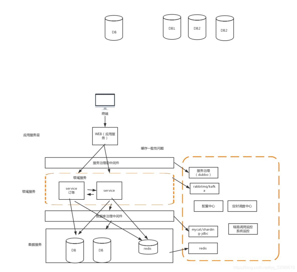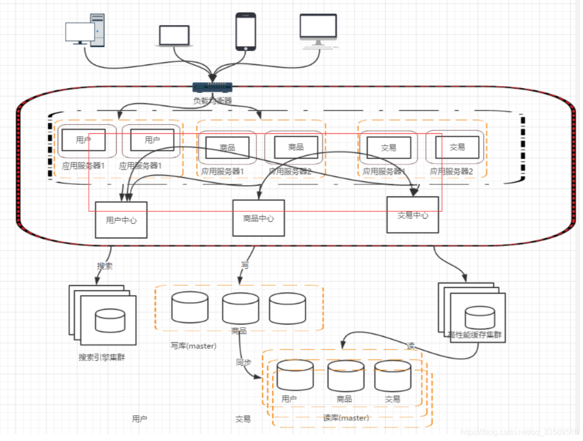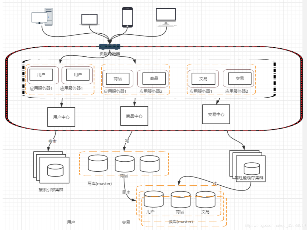 我们的网站演进的变化过程,交易、商品、用户的数据都还在同一 个数据库中,尽管采取了增加缓存,读写分离的方式,但是随着数 据库的压力持续增加,数据库的瓶颈仍然是个最大的问题。因此我 们可以考虑对数据的垂直拆分和水平拆分 垂直拆分:把数据库中不同业务数据拆分到不同的数据库