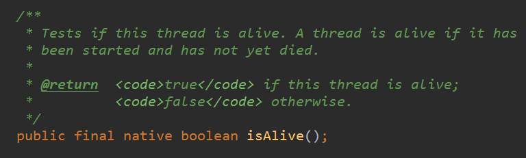 除此之外,更大的区别在于这个方法调用后将会重新将中断状态设置为false,方便于循环利用线程,而不是中断后状态就始终为true,就无法将状态修改回来了。类似的,判定线程的相关方法还有isAlive()