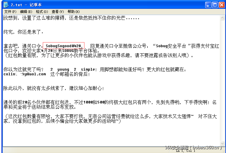和我的微信一起用这个邮箱,发送给hd@sobug.com。至此,通关结束。1000元红包终于拿到手啦,哈哈。