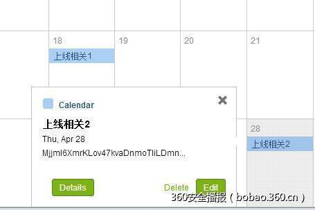 提 示“用这个邮箱把密钥和微信号发过去”,最终应该是通过邮件来确认的。但是,密钥Key是什么呢。这里看到“两个时间”字体被加粗了。眼前一亮,嗯,这个 应该是线索。考虑了下,邮件里那个些和会和时间有关呢?找来找去,那就只有Events这个菜单了。但是,Event显示为空。这时展开下拉按钮,点击 “Calendar”,出现了信息。正好是4月28日和4月18日。这一定就是key了。