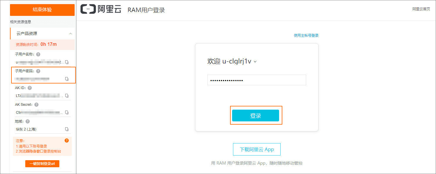 d. 输入密码,单击 登录 进入 阿里云管理控制台 。
