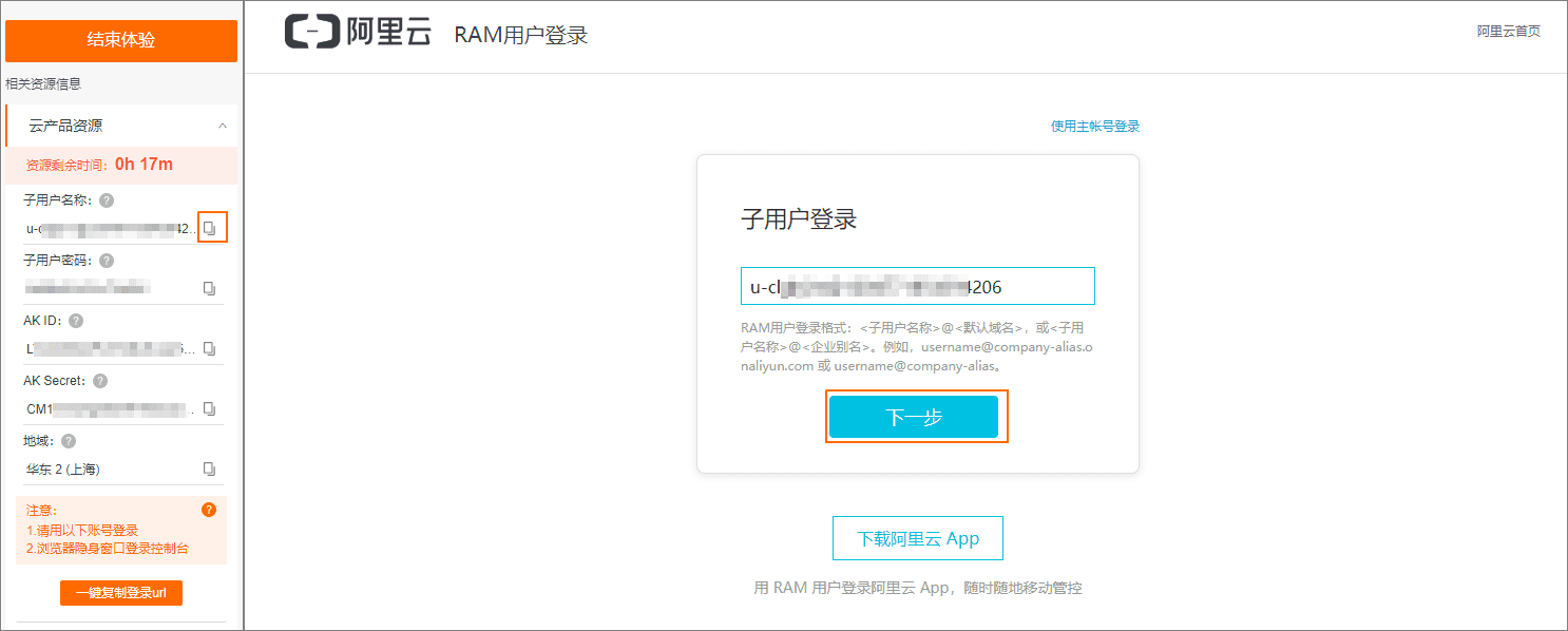 c. 在登录用户名称处,输入 子用户名称 ,单击 下一步 。