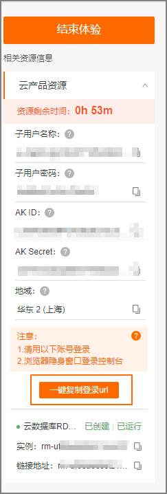 资源创建过程需要1~3分钟。完成实验资源的创建后,您可以在 云产品资源 列表查看已创建的资源信息,例如:IP地址、用户名和密码等。