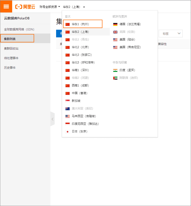 4. 单击左侧 集群列表 ,然后选择云产品资源提供的地域。例如:华东2(上海)。