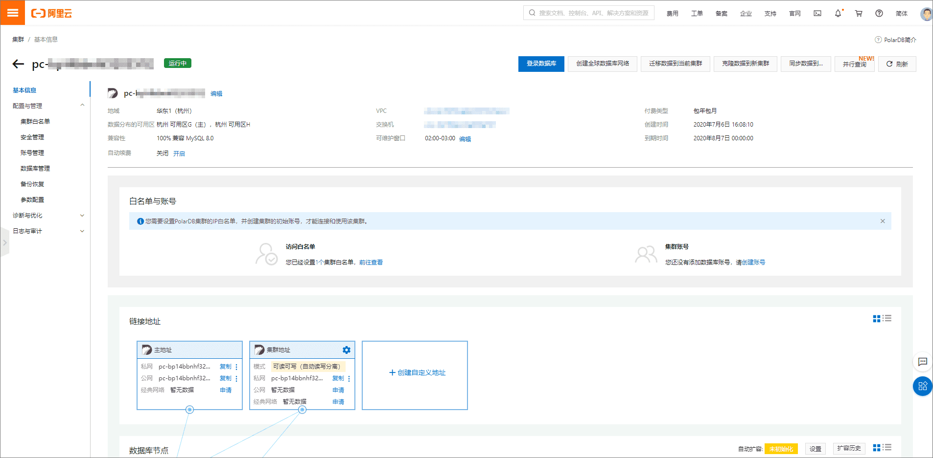 - 数据库连接地址参见集群详情页面下方链接地址板块。