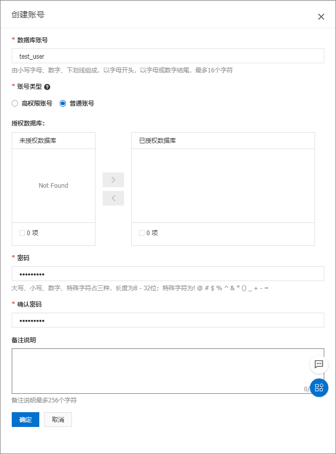 - 数据库账号:输入数据库账号名称,例如:test_user 。