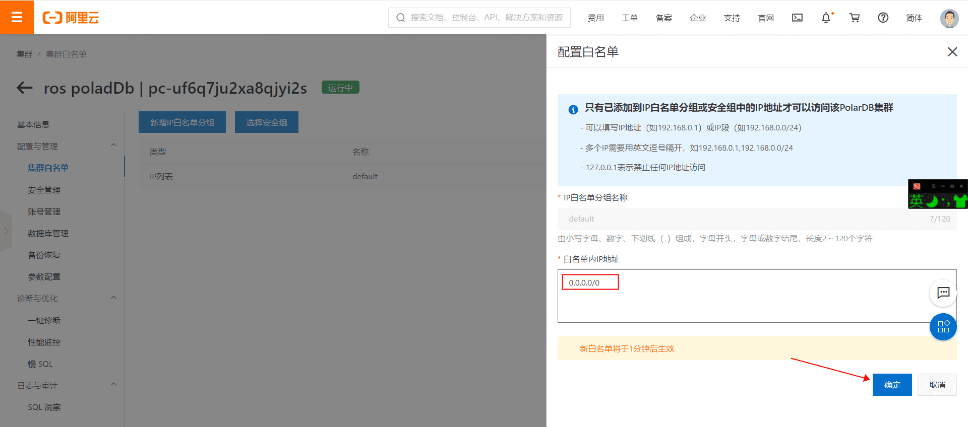在白名单界面将默认的白名单地址127.0.0.1更改为 0.0.0.0/0,然后点击 [确定] 使白名单地址生效。