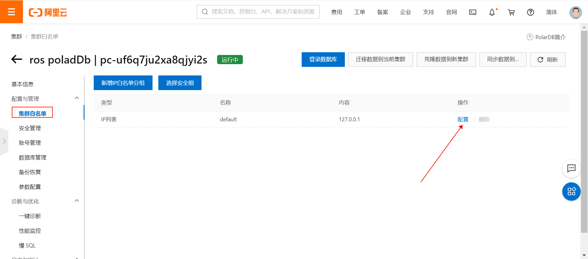 连接数据库需要设置数据库白名单,点击 [集群白名单],然后点击 [设置] 设置数据库集群白名单。