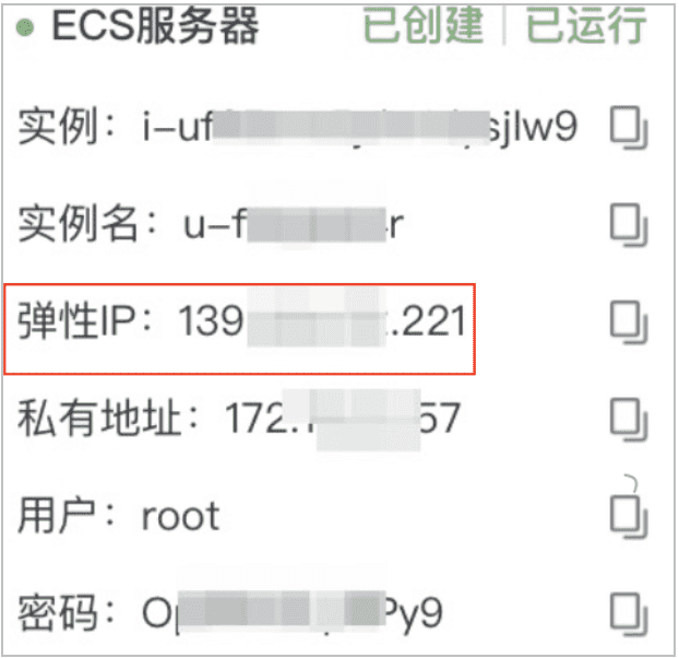 您需要将其中的username和ipaddress替换为步骤一中创建的ECS服务器的弹性公网IP。例如:
